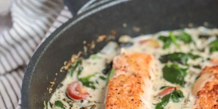 - Add in the chopped spinach and basil, followed by the seared salmon filets and continue to cook for a further 5 minutes until the spinach has wilted. Serve immediately.